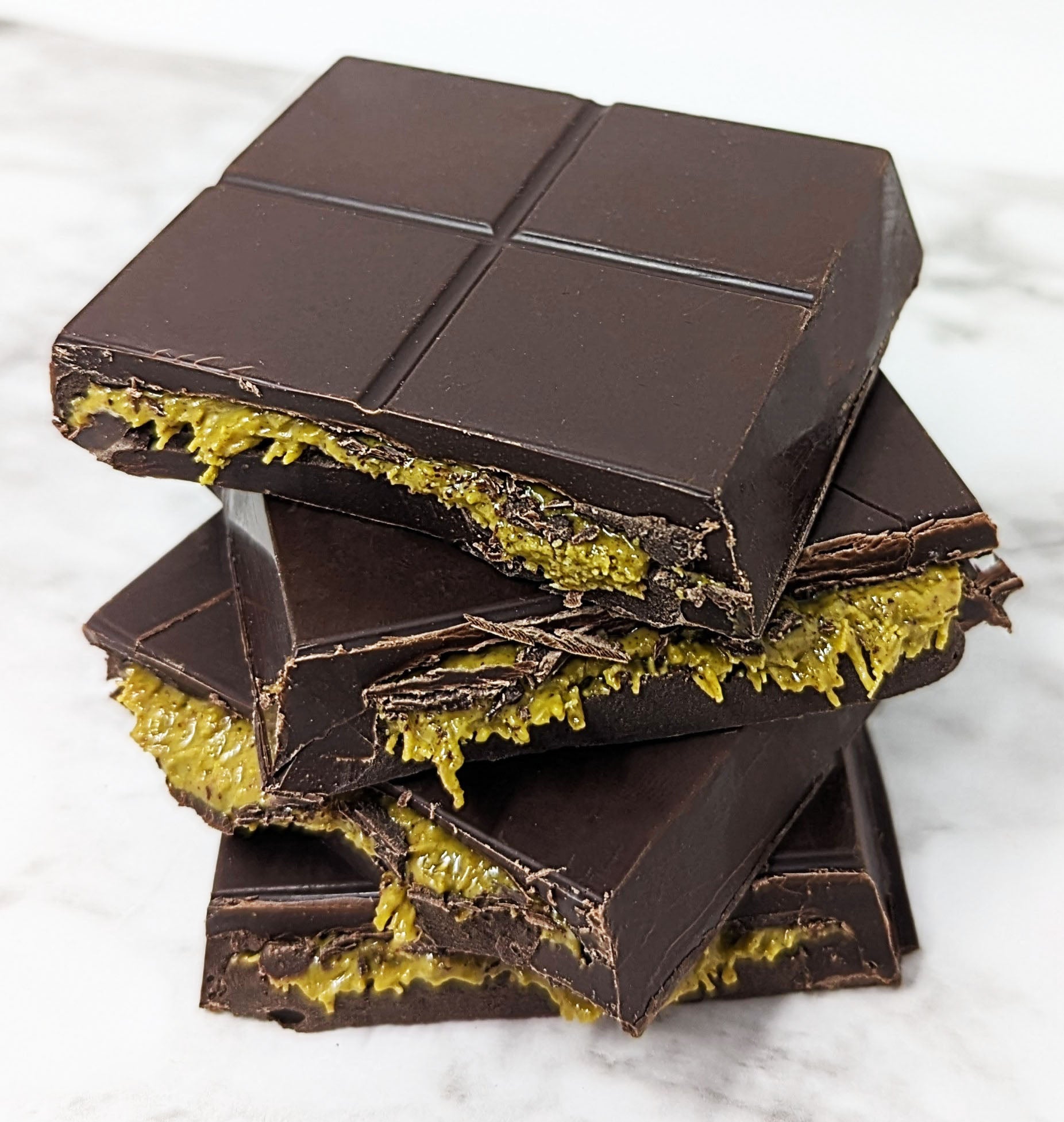 Betty Jane Dark Chocolate filled with a mixture of pistachio cream, Tahini and toasted