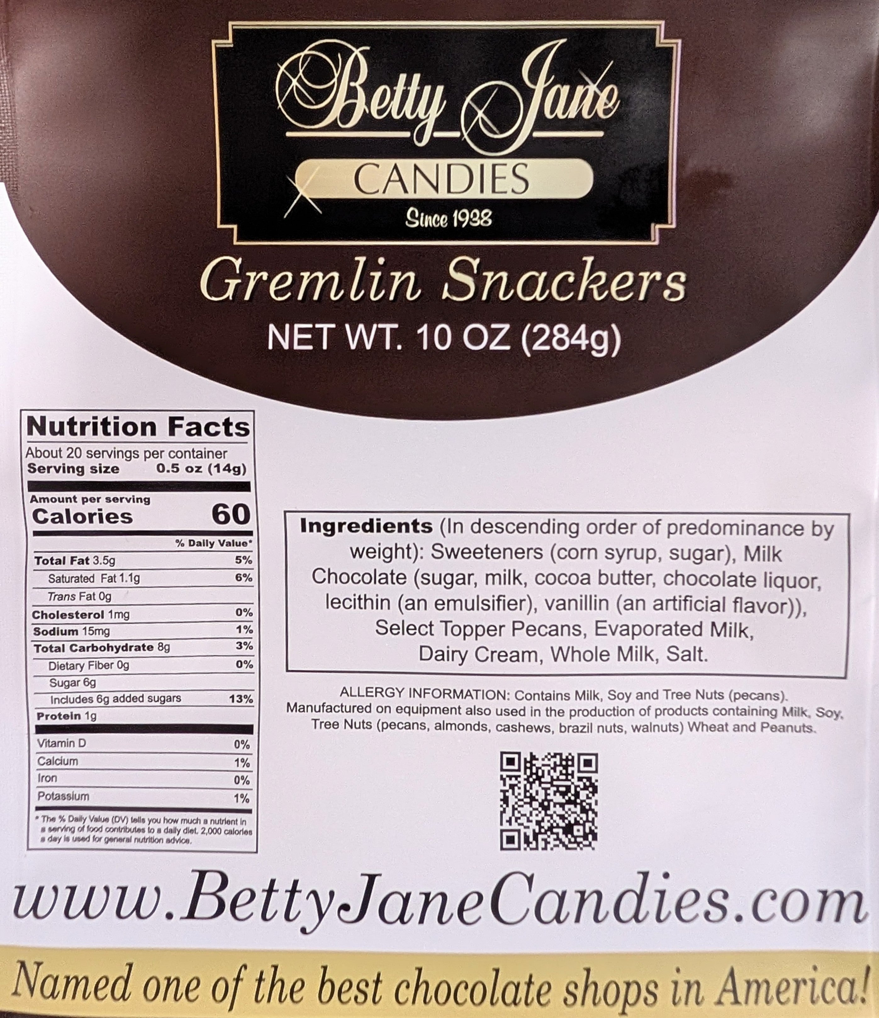 Our signature Gremlins are now available in a snack-able size in a resealable pouch! Topper pecans and our homemade caramel, covered in our special blend of milk chocolate!